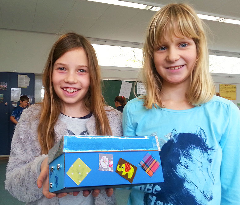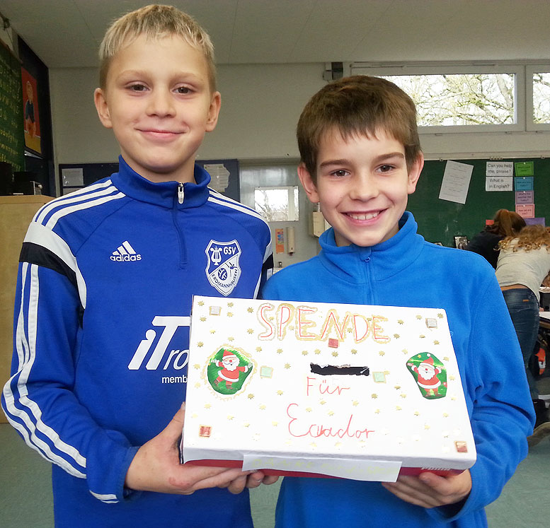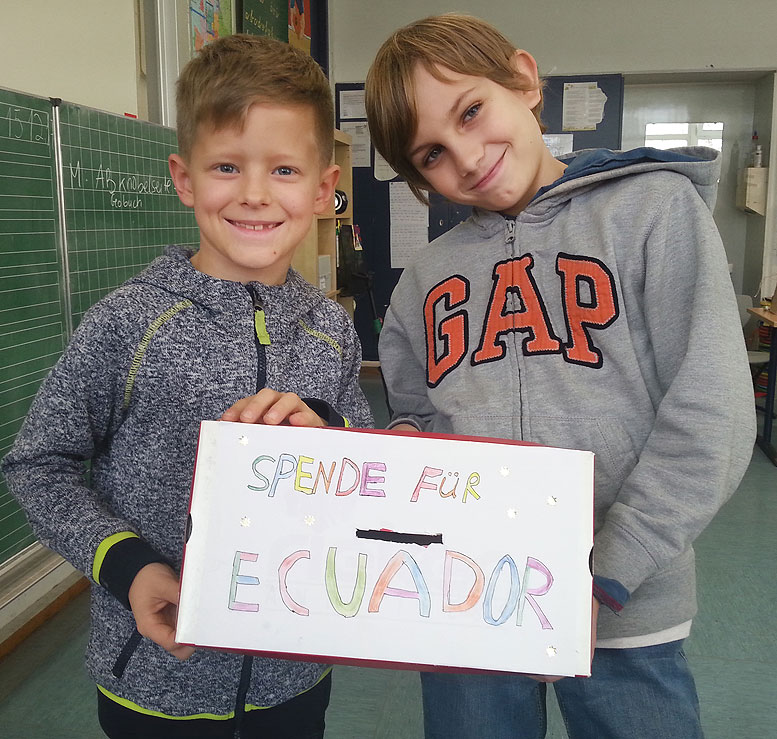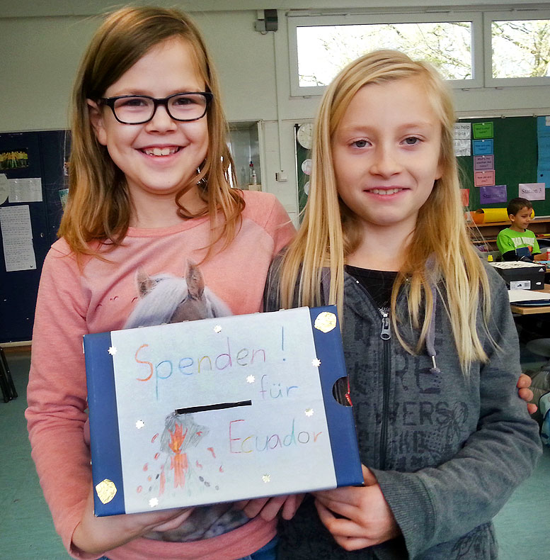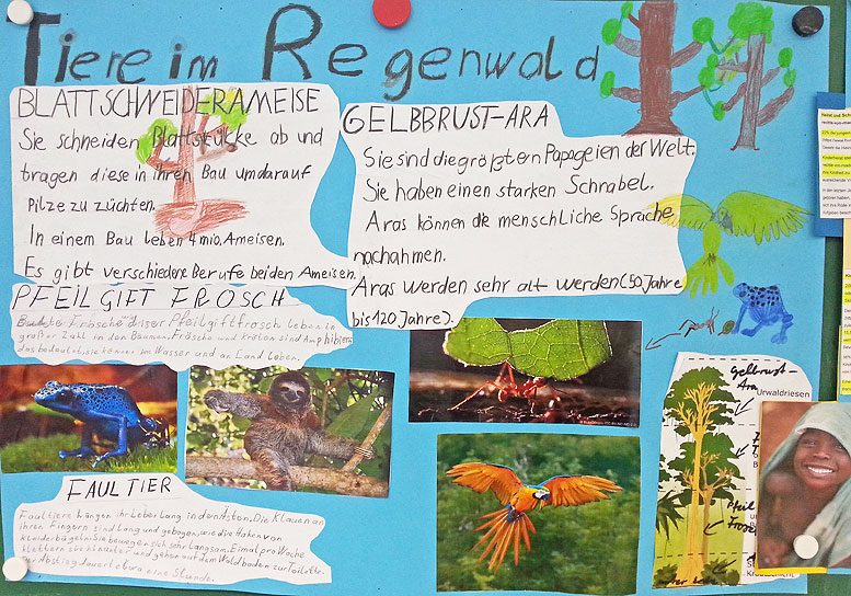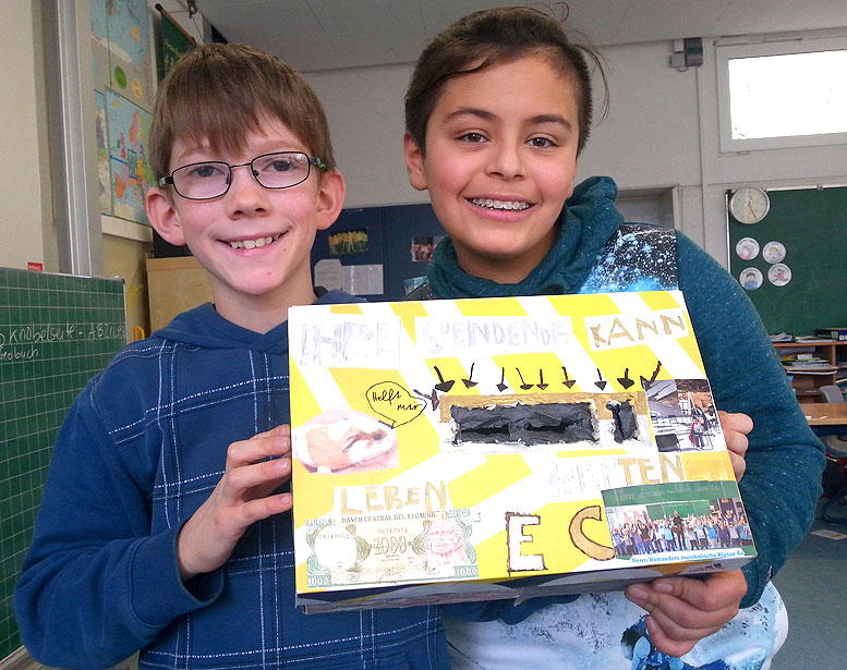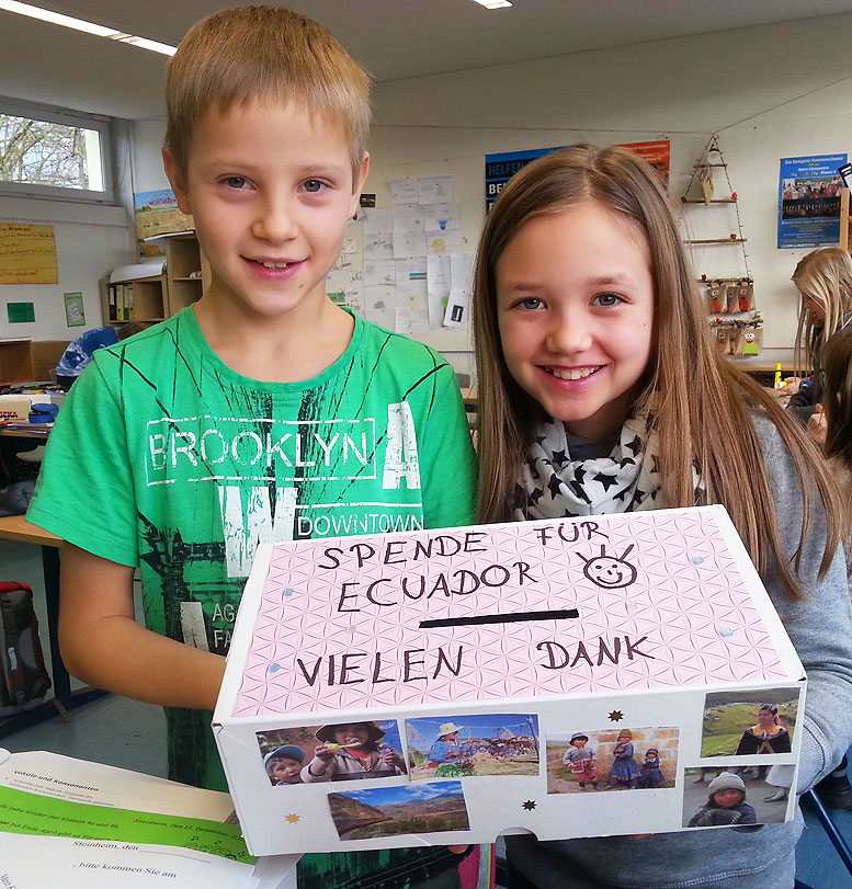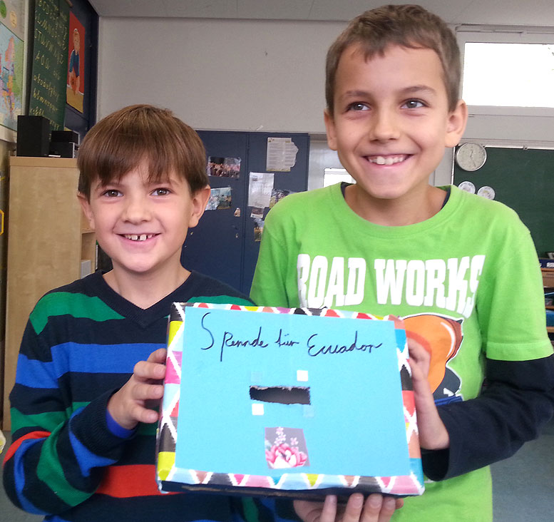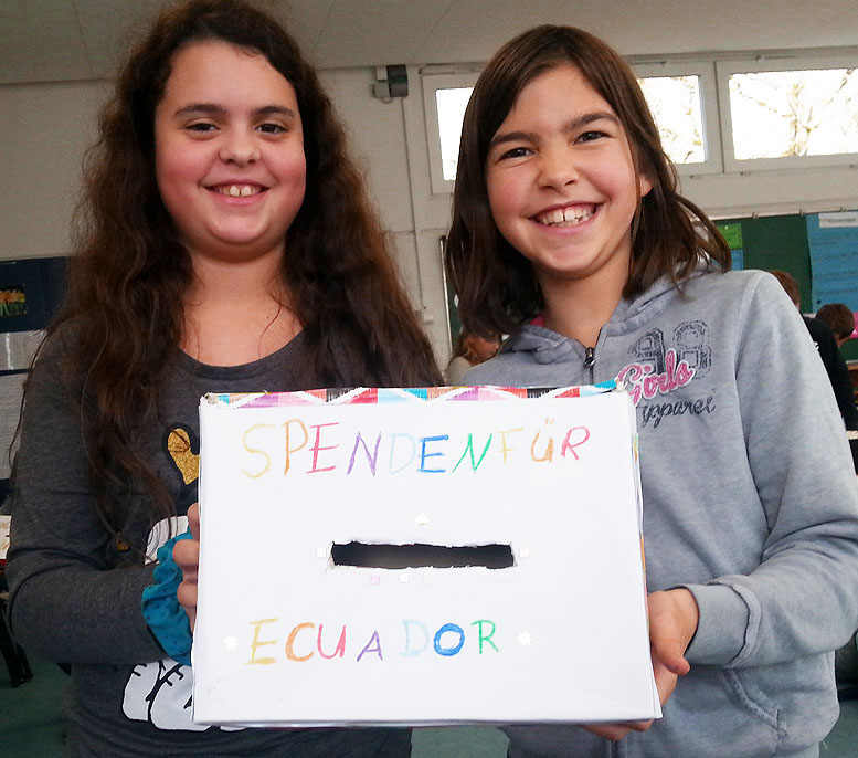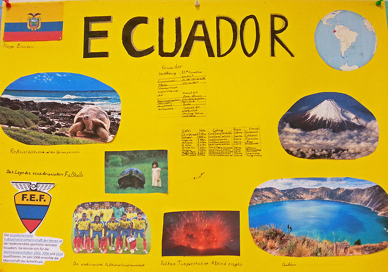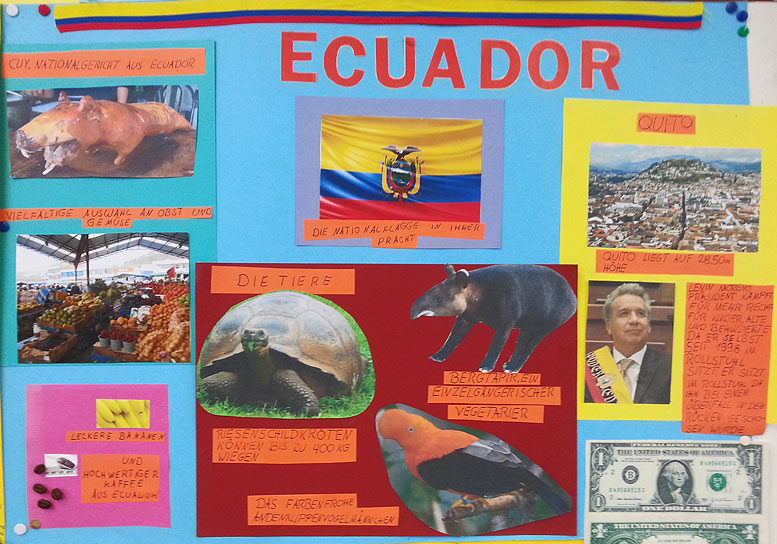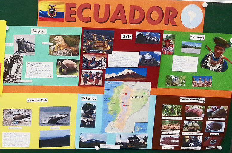 Kreative Plakate, fantasievolle Spendendosen und gekonnte Vorstellungen Die Schüler der Klasse 4a bastelten Plakate über das Thema Ecuador und stellten diese mit entsprechenden Referaten den Mitschülern vor. Die unterschiedlichen Klimate, der Regenwald, die verschiedenen Indianerstämme, aktive und erloschene Vulkane, landesspezifische Tiere all diese Themen wurden von den Schülern recherchiert und gekonnt vorgetragen. Des Öfteren endeten die Vorträge mit einem selbst erfundenen Quiz. Aber auch dunkle Schokolade, Bananen und Teppiche aus Ecuador fanden somit den Weg ins Klassenzimmer.