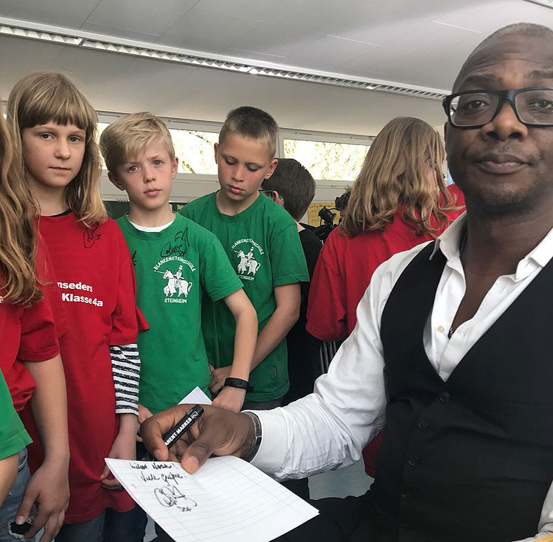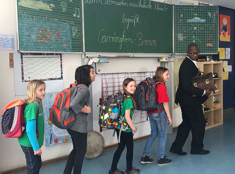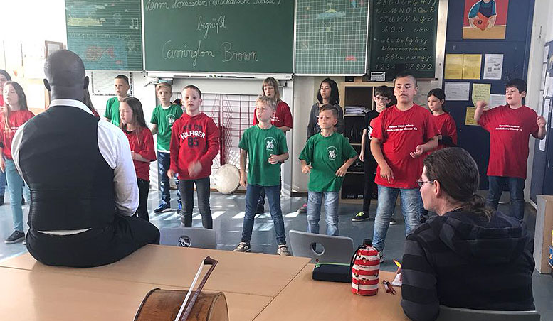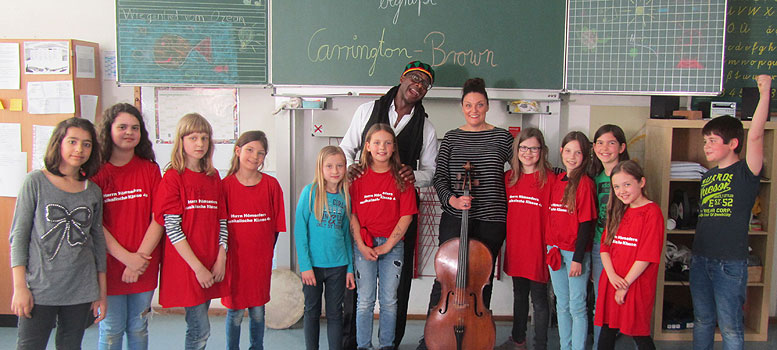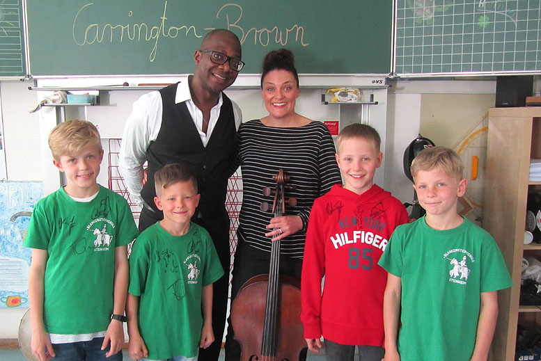 Nach dem "One Note Samba" spielt Brown auf einer Eintonflöte die deutsche Nationalhymne. Die Schüler singen spontan mit und bilden trotz der eher schrägen Flötenklänge einen leisen, aber stimmigen und fast andächtigen Kinderchor. "Wir lieben es, mit Kindern zur arbeiten", sagt Carrington, die sich vom Chorgesang der Viertklässler beeindruckt zeigt.