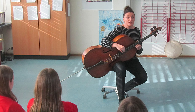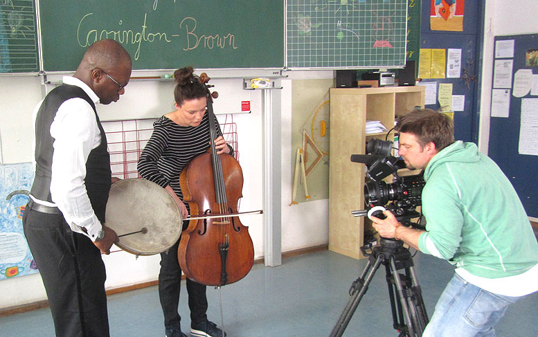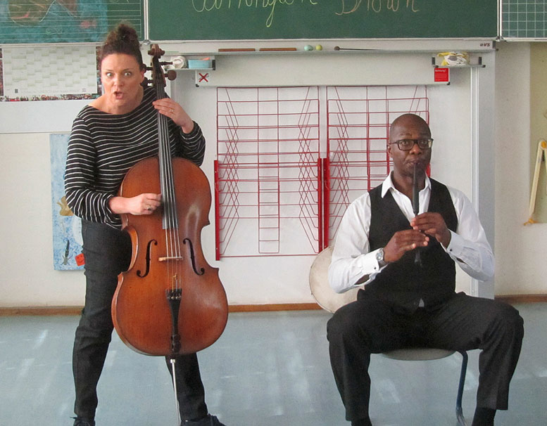 Die Kinder beginnen mit zwei erst auswendig aufgesagten und dann gesungenen und getanzten Gedichten, Rebecca Carrington verwandelt ihr Cello namens "Joe" kurzerhand in eine Sitar und jammert mit stark indischen Akzent "Norwegian Wood" bevor sie zum großen Vergnügen der Kinder zu einer Bollywood - Parodie übergeht. Auch der Rap Song "Seedy Monks" und "The-one-note-samba", bei dem Colin Brown auf einer Dudelsackübungspfeife immer nur eine Note spielt, bringt die Schüler zum Lachen. Das ungewöhnliche Instrument erregt ihr Interesse, und in einer kurzen Pause, in der die Kinder ihn umringen, intoniert Brown darauf die deutsche Nationalhymne. Ganz spontan singen die Kinder mit- mit einer Textsicherheit, von der sich mancher Fußballspieler eine Scheibe abschneiden könnte.