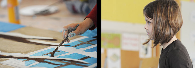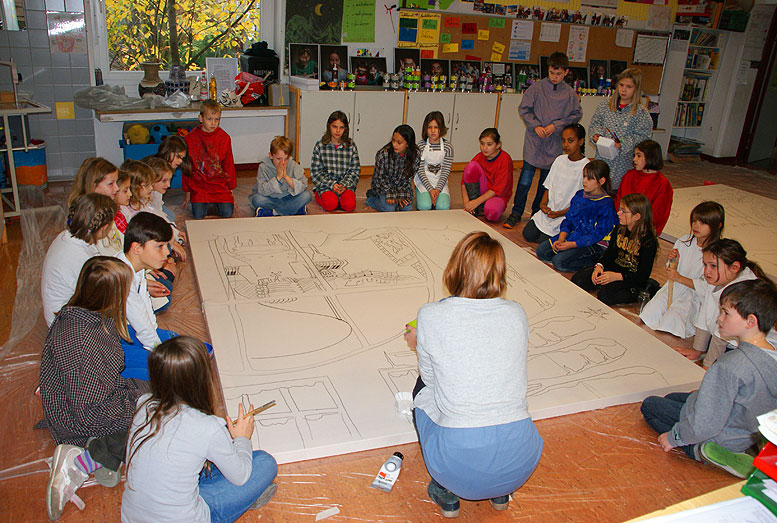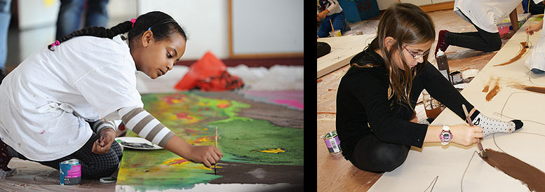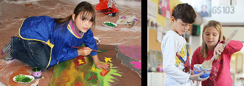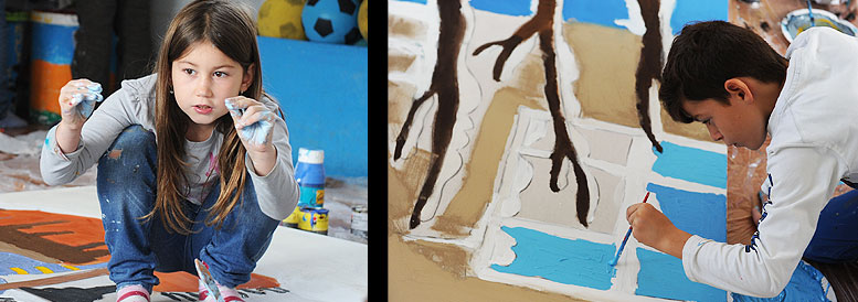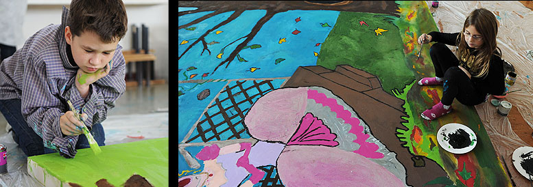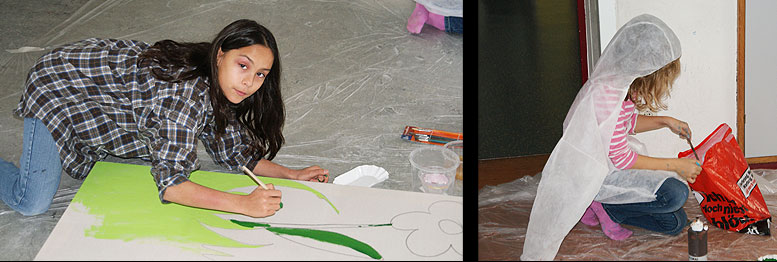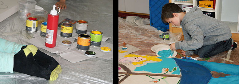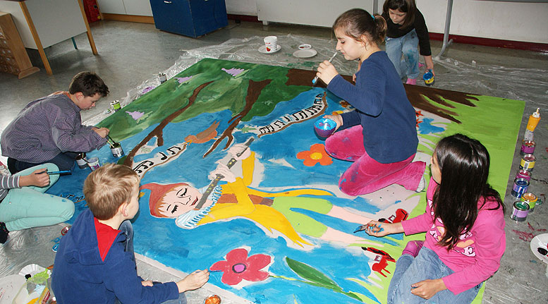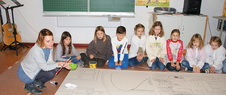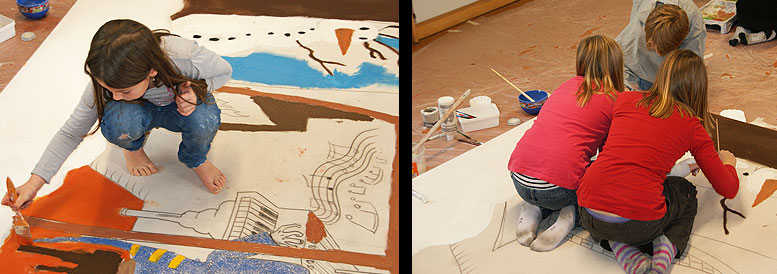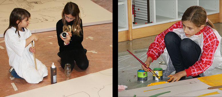 Geigerin des Stuttgarter Kammerorchesters bemalt mit Schülern Projektkulissen