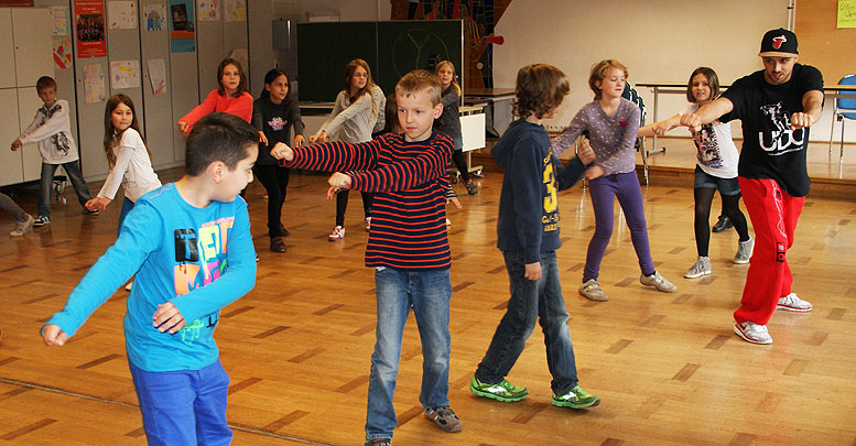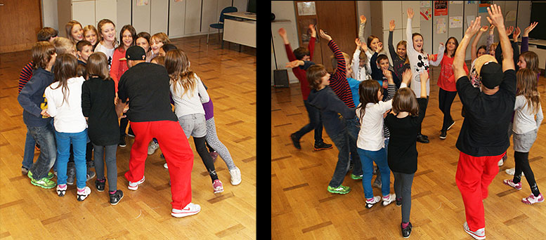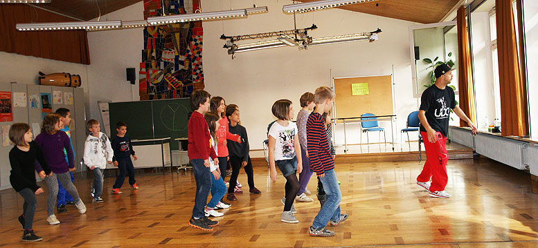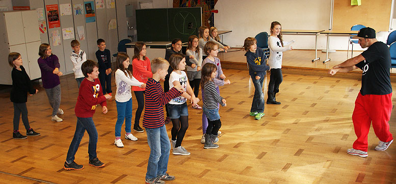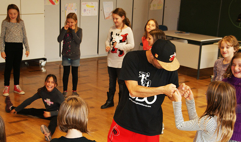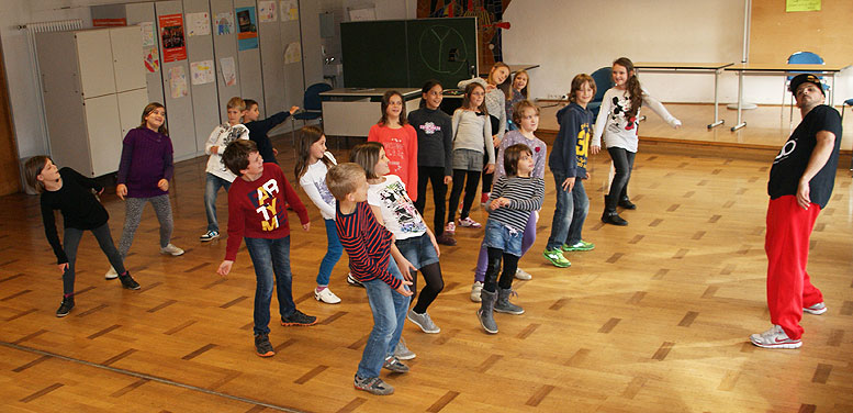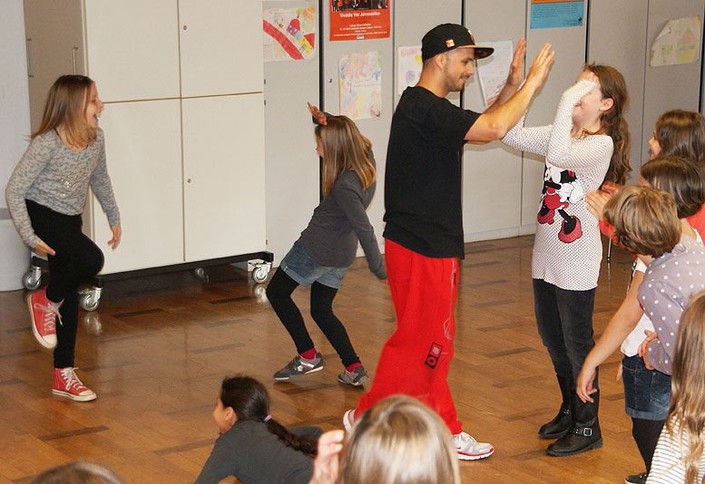 Er gab der musikalischen Klasse einen Workshop im „Hip Hop Dance“.