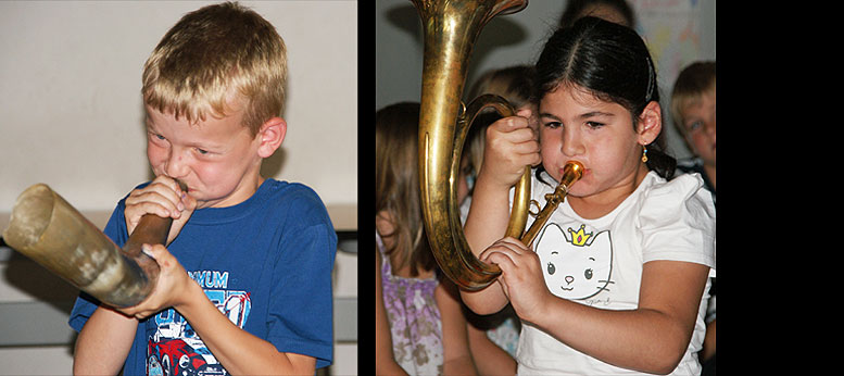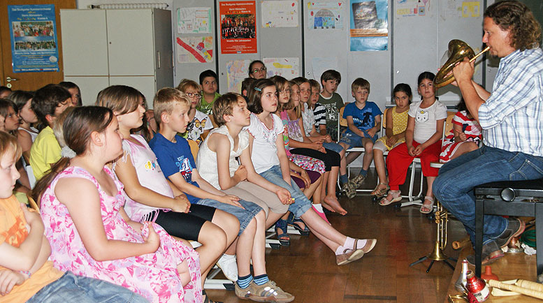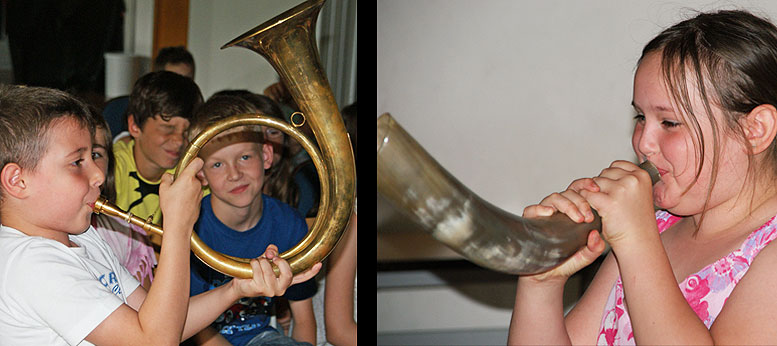 Auch die Entwicklung der Trompete von der Steinzeit bis zur heutigen Zeit wurde den Schülern mit viel Spaß und Elan näher gebracht.
