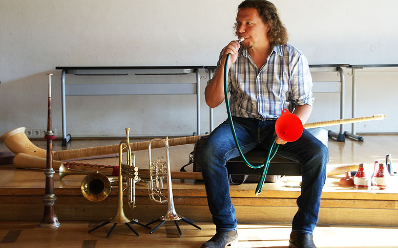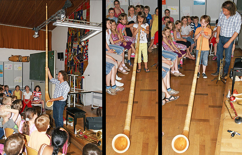 Der ausgewiesene Musikpädagoge stellte, Steinzeittrompeten, Muscheltrompeten, Gartenschlauchtrompeten, Jagdhörner, Fanfaren, Konzerttrompeten aber auch Exoten wie Didgeridoo oder riesige Alpenhörner vor.