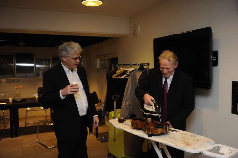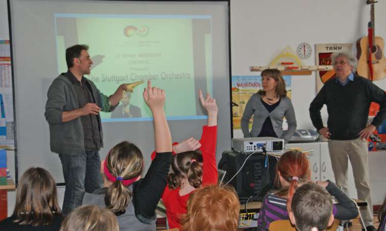 Mit dem Stuttgarter Kammerorchester nach Indien und Norwegen Am 1. März stand eine ungewöhnliche Präsentation auf dem Stundenplan der 4a: Im Rahmen des Projektes "Das Stuttgarter Kammerorchester trifft auf Herrn Hömseders musikalische Klasse 4" besuchten zwei Musiker des weltberühmten Orchesters sowie Fotograf Reiner Pfisterer die Schüler und brachten einige Bilder ihrer jüngsten Konzertreisen mit. Emanuel Wieck (Bratsche) und Kamila Maslowska (Bratsche) kommentierten die ungewöhnlichen Fotografien ihrer Tournee, die das Stuttgarter Kammerorchester nach Indien und Norwegen führten. Sie berichteten von ihrem beruflichen Alltag als Profi-Musiker, von Reisen in ferne Länder und von ausverkauften Konzerten.