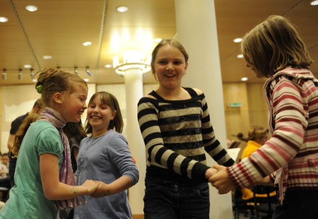 Im Probensaal der Bachakademie probte zu dieser Zeit der mehrfach ausgezeichnete britische Stargeiger und fünffache Klassik Echo Gewinner Daniel Hope mit dem Stuttgarter Kammerorchester für seine anstehende Deutschlandtournee. Die Kinder lauschten fasziniert den klassischen Klängen. Normalerweise muss man hier mucksmäuschenstill sein, aber Daniel Hope forderte die Grundschüler während eines Bachstückes zum Mittanzen auf. Die Kinder ließen sich das nicht zweimal sagen und tanzten fröhlich zur klassischen Musik. Danach schlossen die Kinder die Augen - sie sollten sich Bilder zu Bach vorstellen. "Eine Hochzeitskutsche die in den Sonnenuntergang hineinreitet", interpretierte Nehle ein Musikstück von Bach. Am Ende der Probe trugen die Schüler zwei ihrer musikalischen Schulbuchgedichte vor, die ihr Lehrer Peter Hömseder vertont und zu denen die Schüler eigene passende Bewegungen erfunden hatten. Daniel Hope war von den singenden und tanzenden Kindern so begeistert, dass er spontan sein Handy zückte und den Auftritt der Schüler filmte. Anschließend sang und klatschte er hingebungsvoll das Gedichtlied "Wasser Wasser" mit und lobte die Schüler: "Super! Super!"