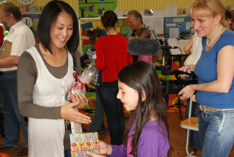 Bei Kaffee, Saft und Kuchen lernten sich die Profimusiker des Stuttgarter Kammerorchesters und die Kinder aus der Musik-AG kennen. Die Drittklässler bastelten den Streichern kleine Geschenke und auch das Ensemble hatte Mitbringsel für ihre Musik-Patenkinder dabei. |