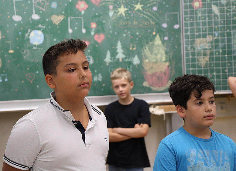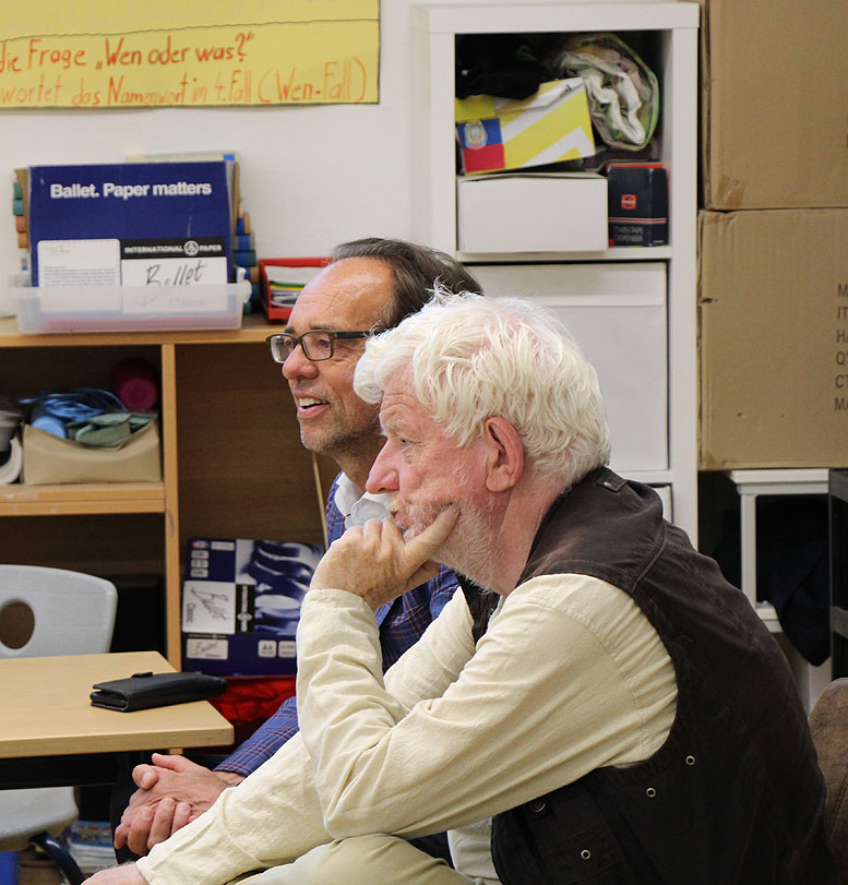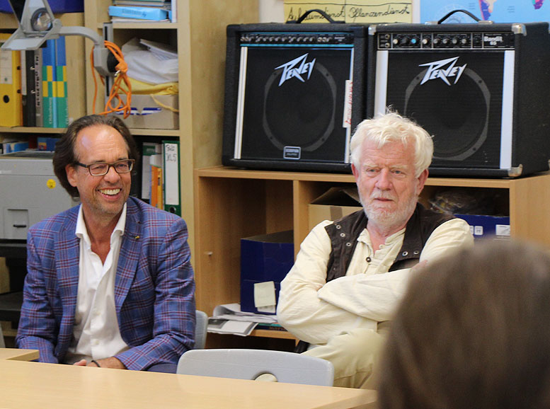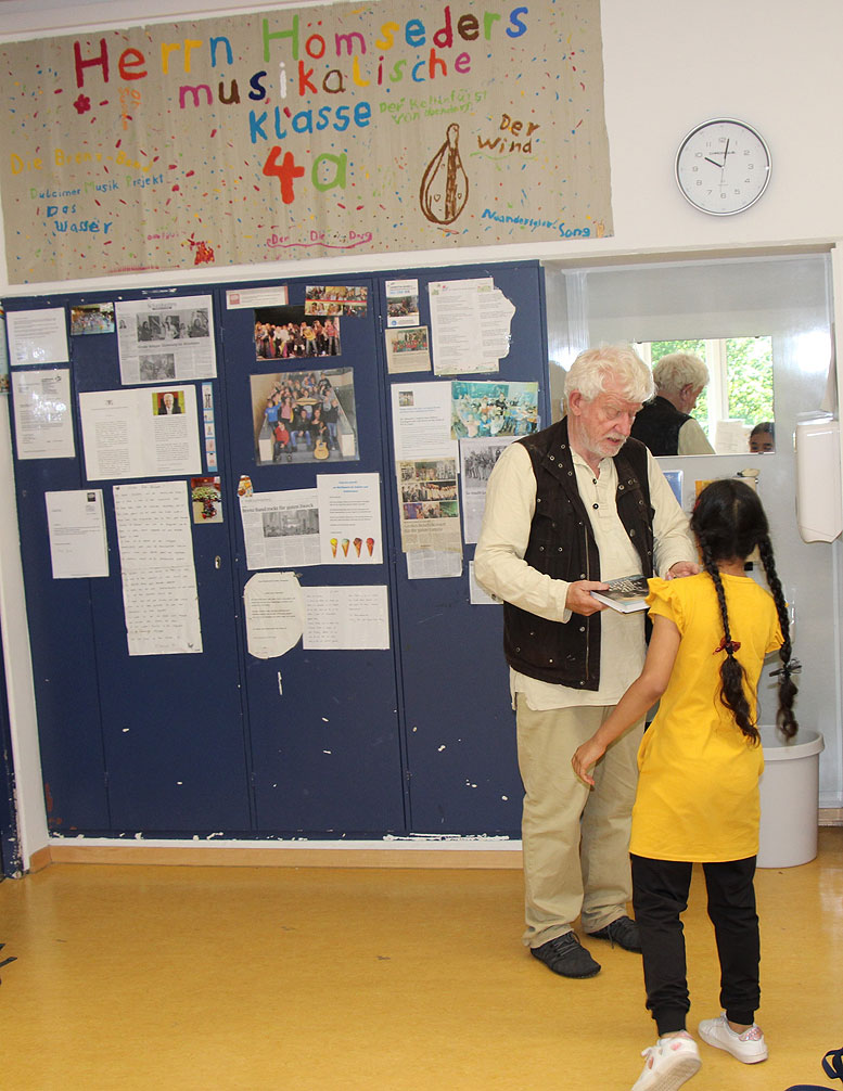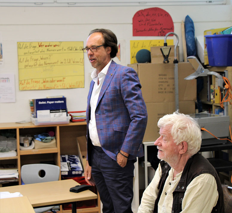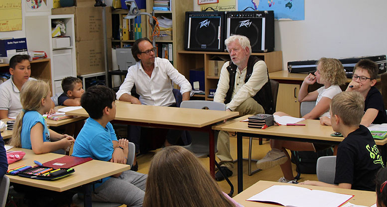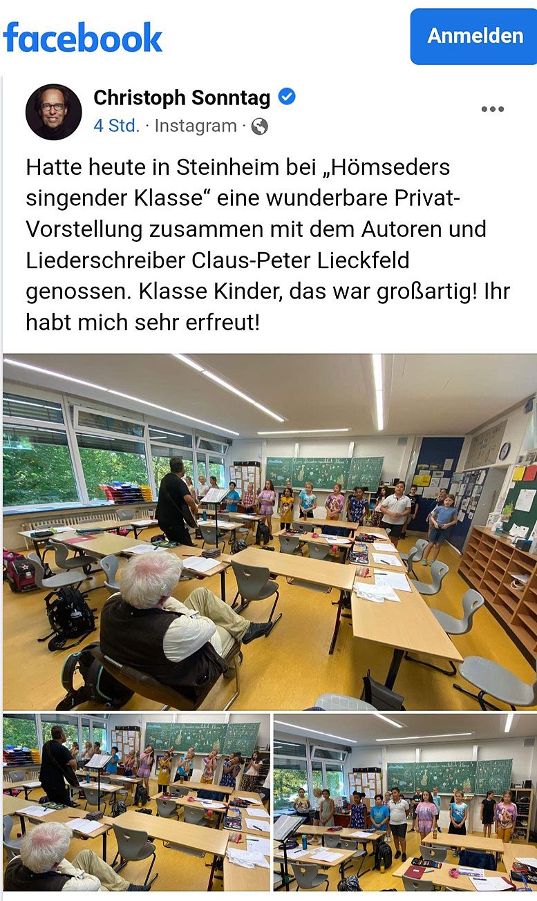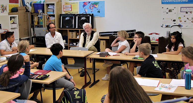 Claus- Peter Lieckfeld und Christoph Sonntag drücken die Schulbank Am 25.7.2022 besuchte der preisgekrönte Schriftsteller und Journalist Claus - Peter Lieckfeld Lieckfeld ist der Autor der Gedichte „Neckarwellen“ und „W-A-L-D“. Um seine Gedichte vertont und in Bewegung zu sehen, reiste er extra vom Ammersee aus dem tiefen Bayern direkt in das Klassenzimmder der 4b. Er brachte auch seinen Freund den Kabarettisten Christoph Sonntag mit. Beide waren begeistert von den gedichtrezitierenden, singenden Rockknirpsen und spendeten Standing Ovations. Die Grundschüler wiederum ließen es sich nicht nehmen, den beiden Persönlichkeiten „Löcher in den Bauch“ zu fragen und Autogramme abzuholen. |