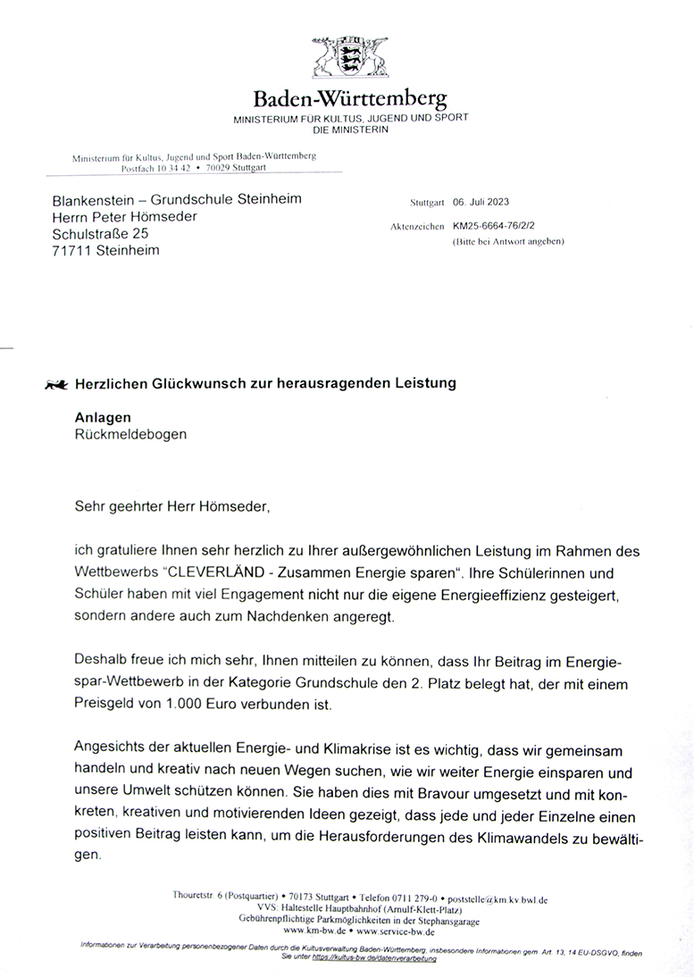 Das Prima Klima Lied von Herrn Hömseders musikalischer Klasse 4 wurde vom Land Baden-Württemberg ausgzeichnet und als Herausragende Leistung gewürdigt.